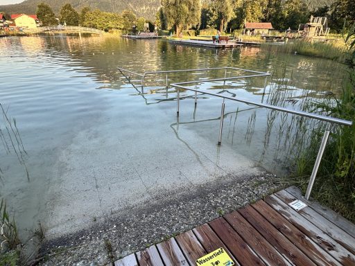 => Barriererfrei bis zum See. An der Westseite (nach dem Eingang rechts am Hallenbad vorbeigehen) kann man ohne Stufen entweder am Geländer oder auch mit Rollstuhl in den See gelangen