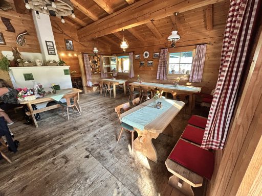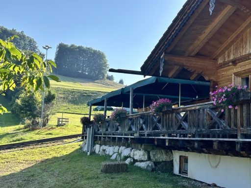 Die Eltern sitzen auf der Alm, die Kinder rutschen auf den Reifen in Sichtweite. Im rutscht man mit Reifen auf einer Wasserbahn, im Winter auf Schnee.