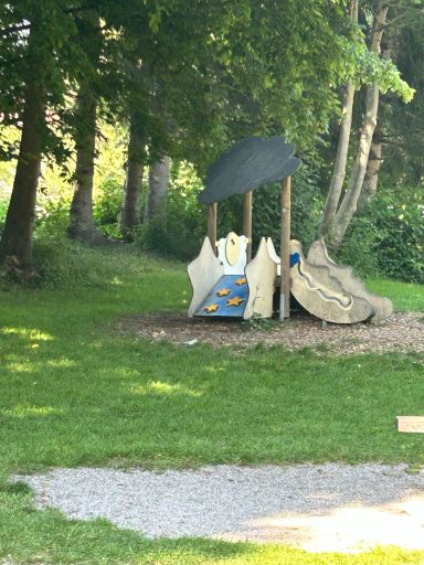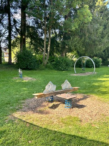 Netter Kleinkinderspielplatz mit vielen Spielgeräten und Sandkasten.